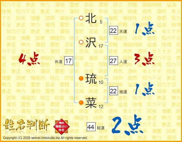 北(5画)沢(17画) 琉(10画)菜(12画)