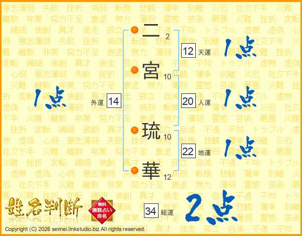 生活面を象徴する運勢です。外部から受ける影響力を表し、結婚運、家庭運や職場、環境への順応性を表します。総運から人運を引いた画数。姓や名が1文字の場合を除く。