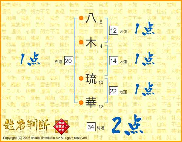 生活面を象徴する運勢です。外部から受ける影響力を表し、結婚運、家庭運や職場、環境への順応性を表します。総運から人運を引いた画数。姓や名が1文字の場合を除く。