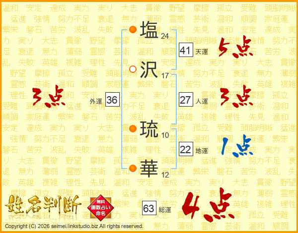 塩(24画)沢(17画) 琉(10画)華(12画)