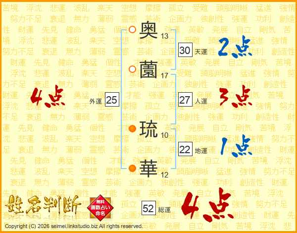 奥(13画)薗(17画) 琉(10画)華(12画)
