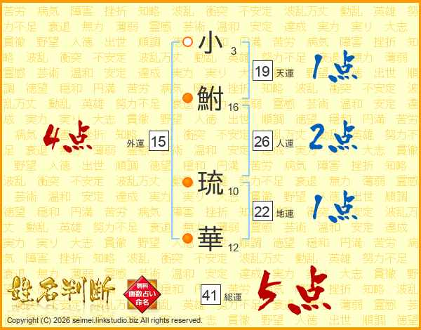 小(3画)鮒(16画) 琉(10画)華(12画)