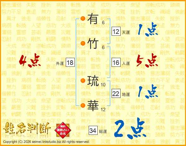 有(6画)竹(6画) 琉(10画)華(12画)