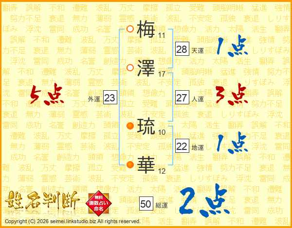梅(11画)澤(17画) 琉(10画)華(12画)