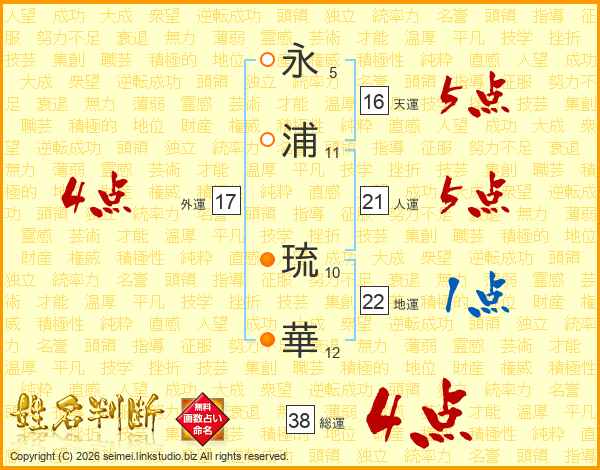 生活面を象徴する運勢です。外部から受ける影響力を表し、結婚運、家庭運や職場、環境への順応性を表します。総運から人運を引いた画数。姓や名が1文字の場合を除く。