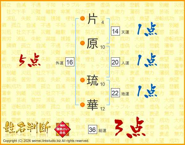 片(4画)原(10画) 琉(10画)華(12画)