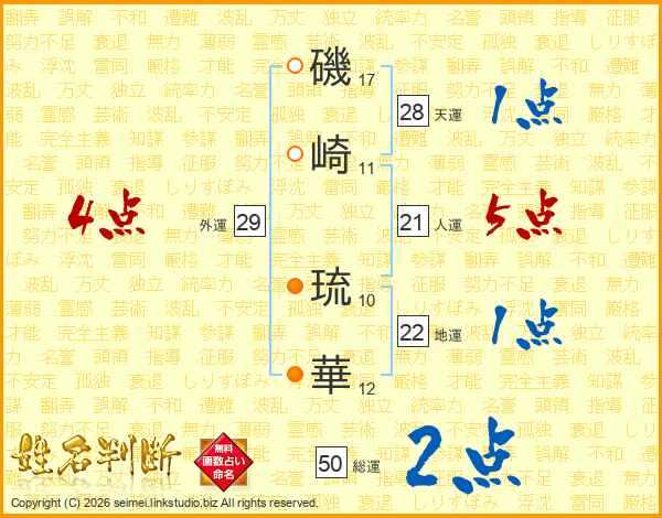 磯(17画)崎(11画) 琉(10画)華(12画)