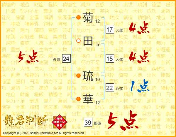 菊田琉華さんの総運は39画の5点!