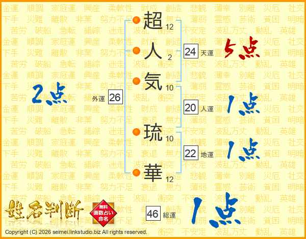 超人気琉華さんの天運は24画の5点!