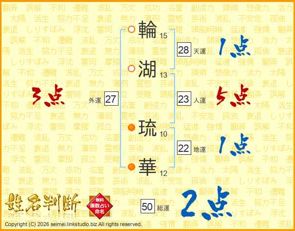 輪(15画)湖(13画) 琉(10画)華(12画)
