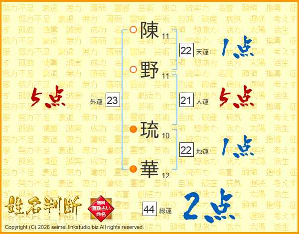 生活面を象徴する運勢です。外部から受ける影響力を表し、結婚運、家庭運や職場、環境への順応性を表します。総運から人運を引いた画数。姓や名が1文字の場合を除く。