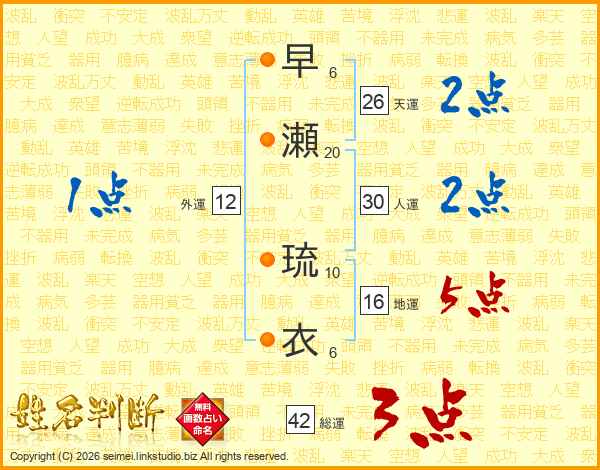 早(6画)瀬(20画) 琉(10画)衣(6画)