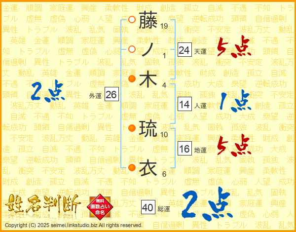 藤(19画)ノ(1画)木(4画) 琉(10画)衣(6画)