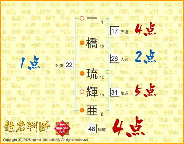 一(1画)橋(16画) 琉(10画)輝(13画)亜(8画)