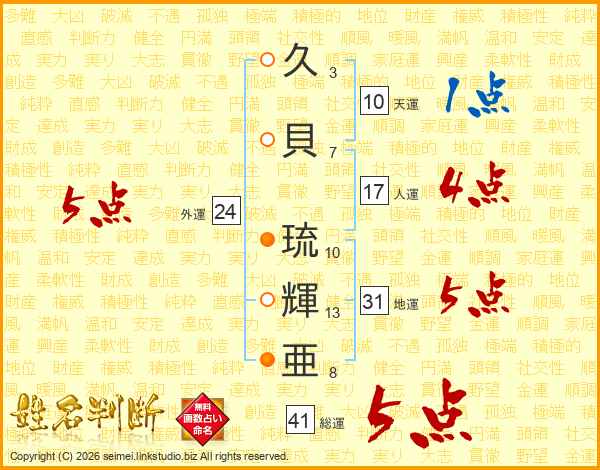 久(3画)貝(7画) 琉(10画)輝(13画)亜(8画)