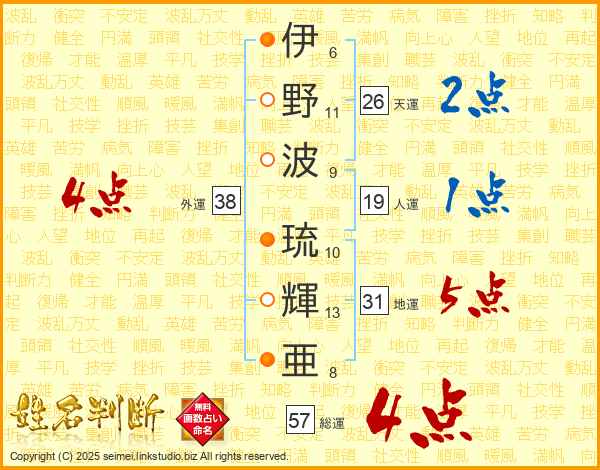 伊(6画)野(11画)波(9画) 琉(10画)輝(13画)亜(8画)