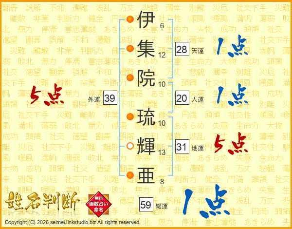伊(6画)集(12画)院(10画) 琉(10画)輝(13画)亜(8画)
