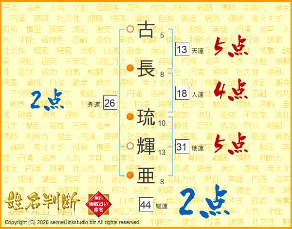 古(5画)長(8画) 琉(10画)輝(13画)亜(8画)
