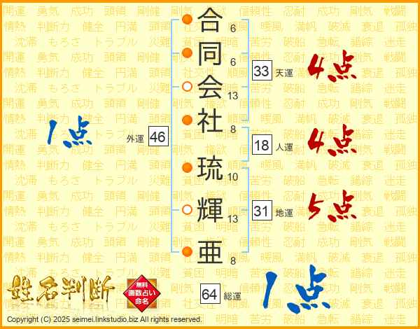 合(6画)同(6画)会(13画)社(8画) 琉(10画)輝(13画)亜(8画)