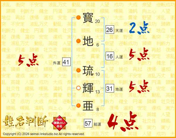 寳(20画)地(6画) 琉(10画)輝(13画)亜(8画)