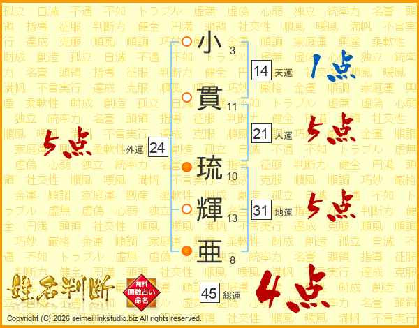 小(3画)貫(11画) 琉(10画)輝(13画)亜(8画)