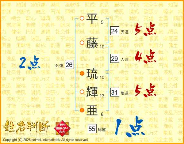 平(5画)藤(19画) 琉(10画)輝(13画)亜(8画)
