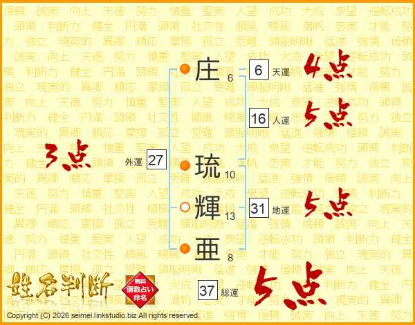 庄(6画) 琉(10画)輝(13画)亜(8画)