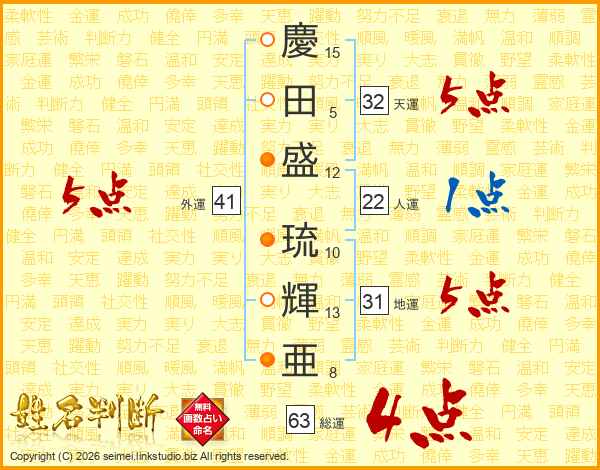 慶田盛琉輝亜さんの総運は63画の4点!