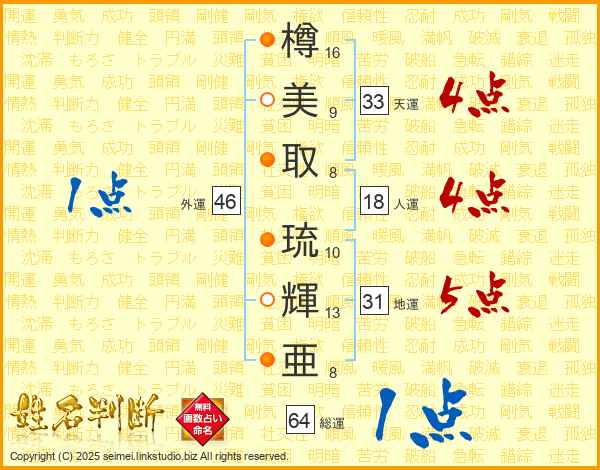 樽(16画)美(9画)取(8画) 琉(10画)輝(13画)亜(8画)