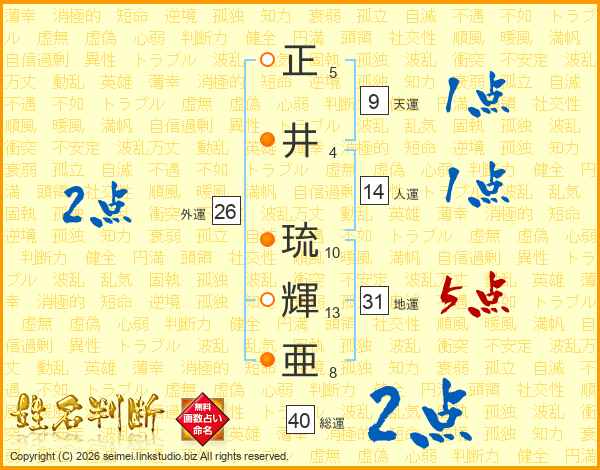 正(5画)井(4画) 琉(10画)輝(13画)亜(8画)