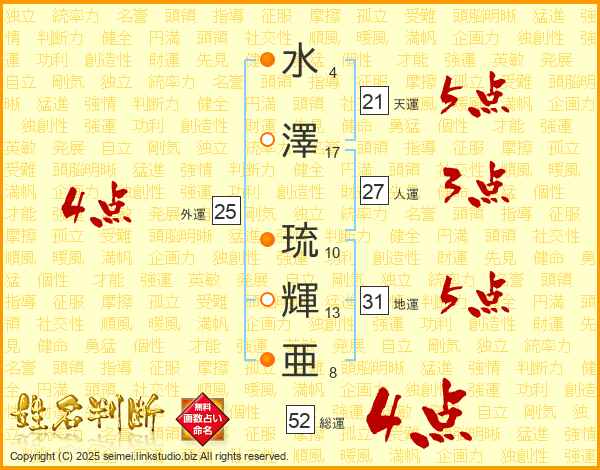 水(4画)澤(17画) 琉(10画)輝(13画)亜(8画)
