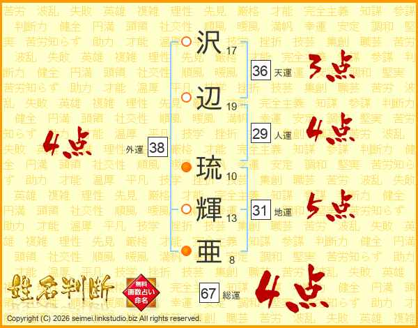 沢(17画)辺(19画) 琉(10画)輝(13画)亜(8画)