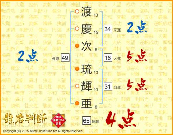渡(13画)慶(15画)次(6画) 琉(10画)輝(13画)亜(8画)