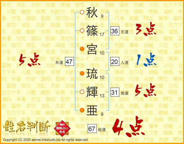 秋篠宮琉輝亜さんの総運は67画の4点!