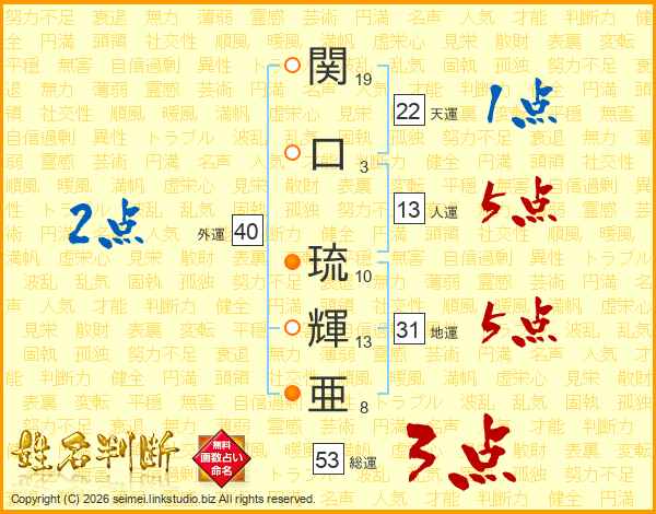 関(19画)口(3画) 琉(10画)輝(13画)亜(8画)
