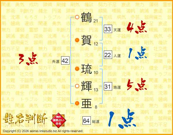 鶴(21画)賀(12画) 琉(10画)輝(13画)亜(8画)