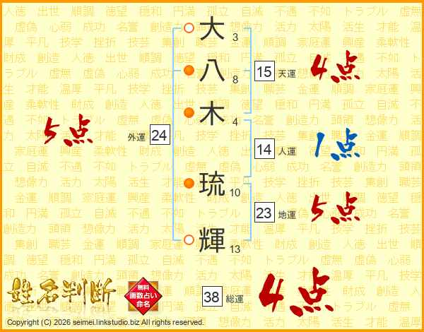 大(3画)八(8画)木(4画) 琉(10画)輝(13画)
