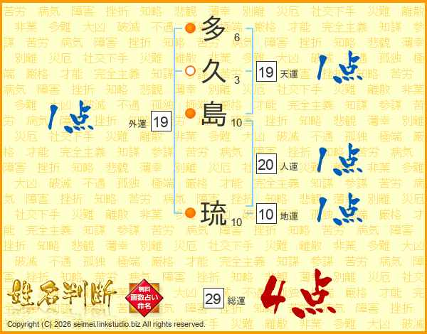 家系が持つ宿命的な運勢を表します。祖先から受け継いだ苗字ですので自分の力が及びません。家柄を象徴します。苗字の合計画数。