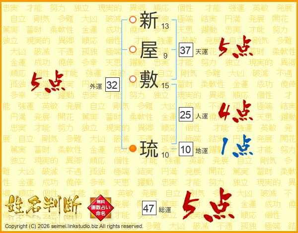 新(13画)屋(9画)敷(15画) 琉(10画)