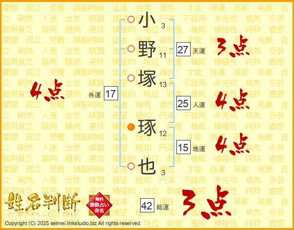 小(3画)野(11画)塚(13画) 琢(12画)也(3画)