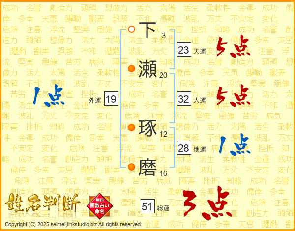 下瀬琢磨さんの総運は51画の3点!