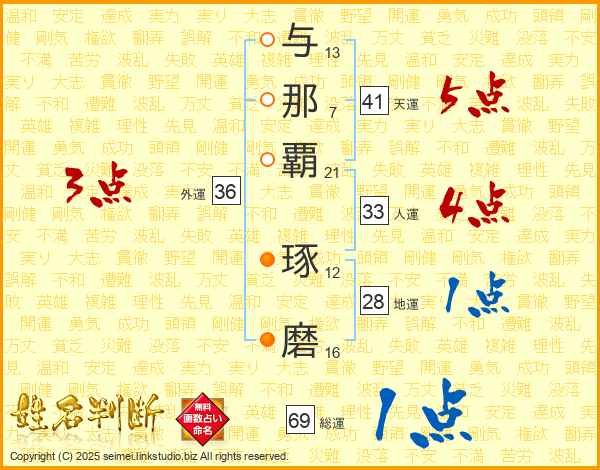 与(13画)那(7画)覇(21画) 琢(12画)磨(16画)