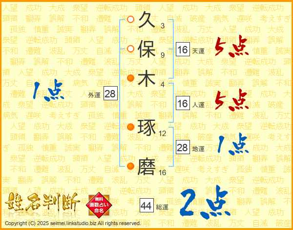 久(3画)保(9画)木(4画) 琢(12画)磨(16画)
