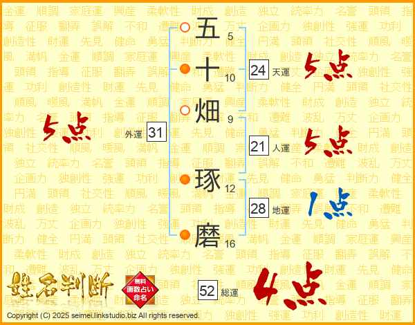 生活面を象徴する運勢です。外部から受ける影響力を表し、結婚運、家庭運や職場、環境への順応性を表します。総運から人運を引いた画数。姓や名が1文字の場合を除く。