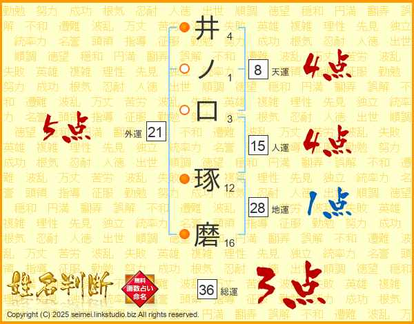 井(4画)ノ(1画)口(3画) 琢(12画)磨(16画)