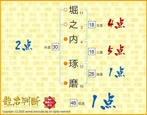 堀(11画)之(3画)内(4画) 琢(12画)磨(16画)