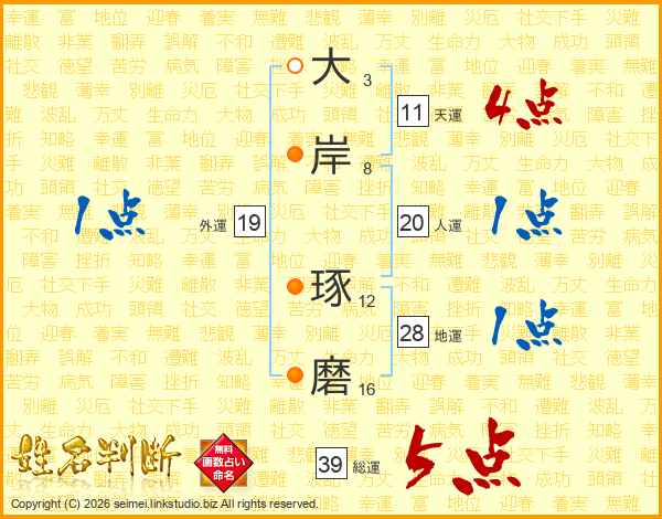 あなたの人生を表す1番重要な運勢です。生涯を通じて影響する総合運となり、主に50歳以降の晩年期に影響を及ぼします。苗字と名前の合計画数。