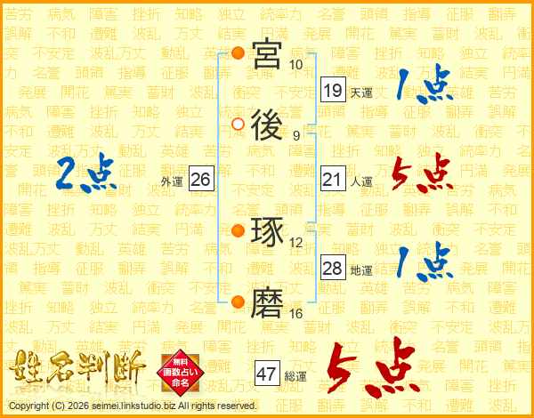 宮(10画)後(9画) 琢(12画)磨(16画)