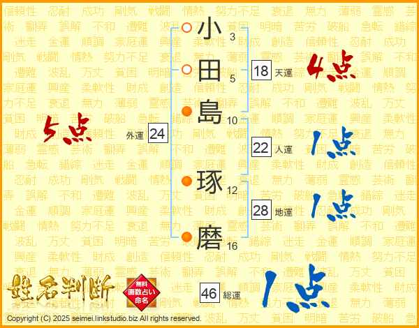 小(3画)田(5画)島(10画) 琢(12画)磨(16画)
