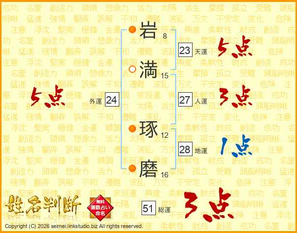 岩(8画)満(15画) 琢(12画)磨(16画)